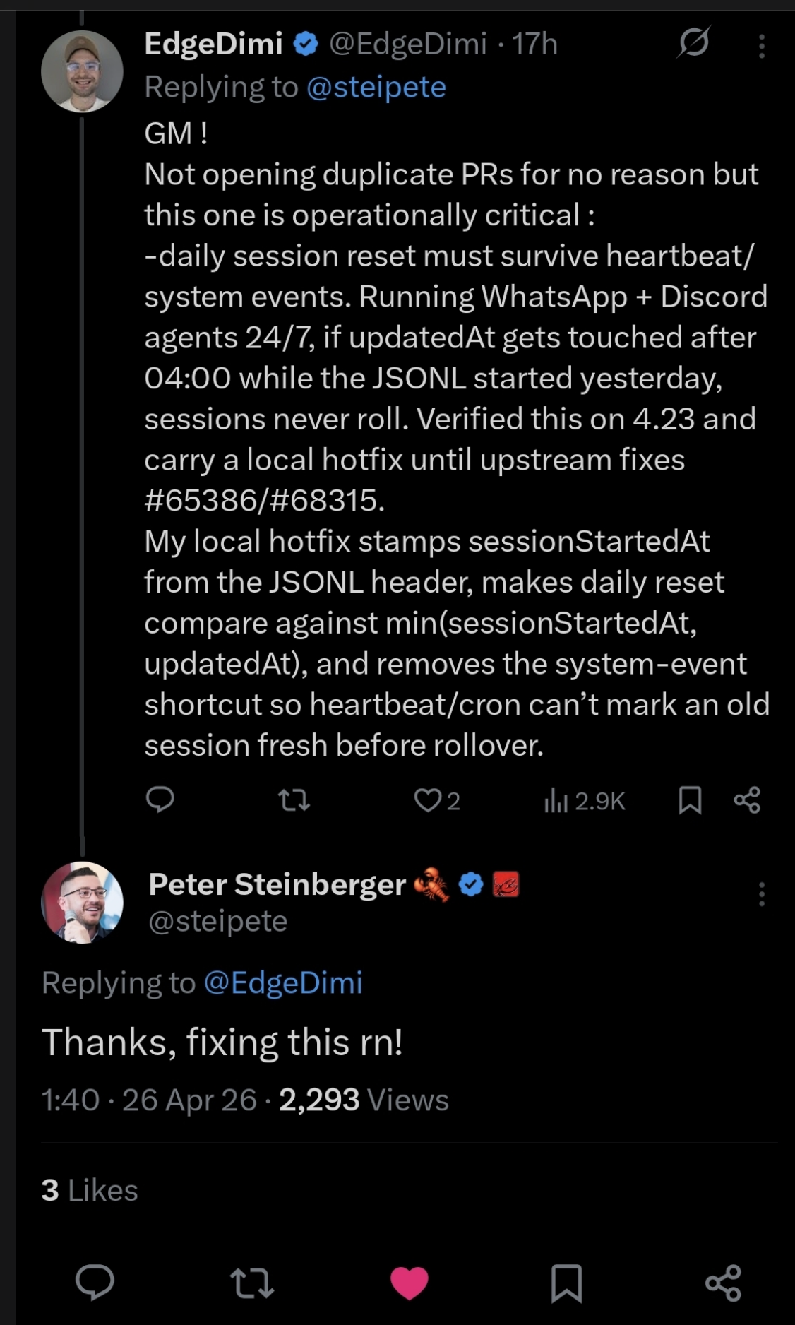 After verifying the session-reset regression on 2026.4.23, I posted the exact production issue publicly to Peter Steinberger, founder of OpenClaw, including the business impact and the local patch shape we were carrying.